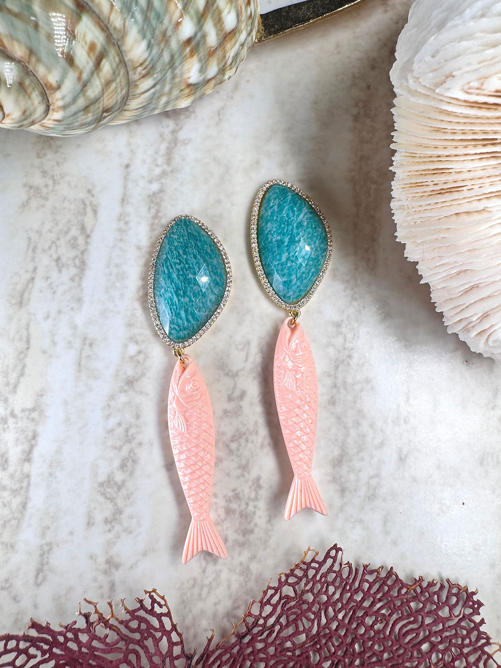 Aretes de caracoles naturales en baño de oro con piedras naturales .