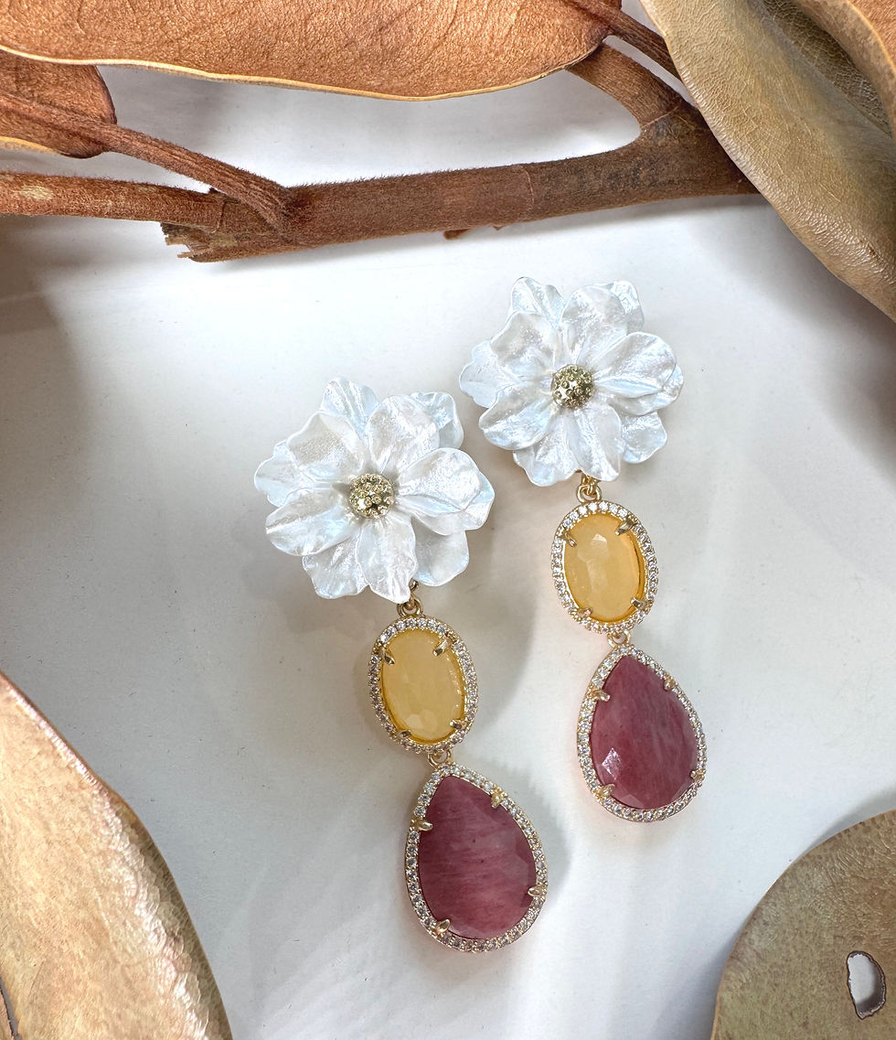 Aretes de perlas naturales con flor en resina y moño en cristales .